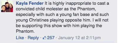 Fans also sounded off on the Broadway show’s Twitter and Facebook pages, taking Phantom's producers to task for their dubious casting choice and their insensitivity to sexual assault victims. Many also took issue with the fact that Barbour was cast as a romantic lead, sending a troubling message to young female fans of the show.