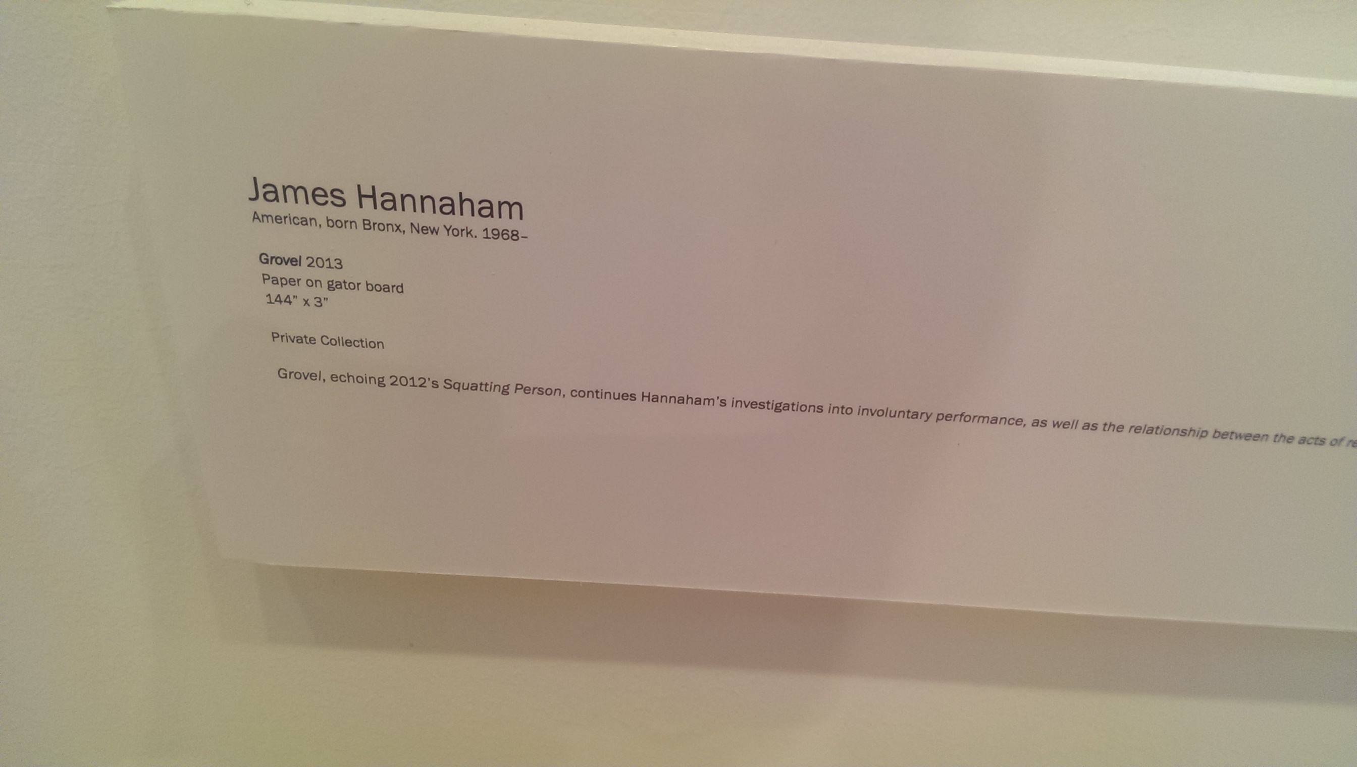 It occurred to me, when squatting down and waddling along the baseboards to read the long strip of text mounted about ten inches off the ground called “Grovel,” that Hannaham’s jokes about “involuntary audience performance” were all the funnier for being completely serious. “I want to fuck shit up,” he said when asked about his ambitions as a writer and artist. And yet “Card Tricks” is more about the absurd exhaustion of certain techniques than forging new ones. “It doesn’t work in an exhibit with other artist’s work,” he remarked, “because people think whatever is to the left of the placard is the art described.”