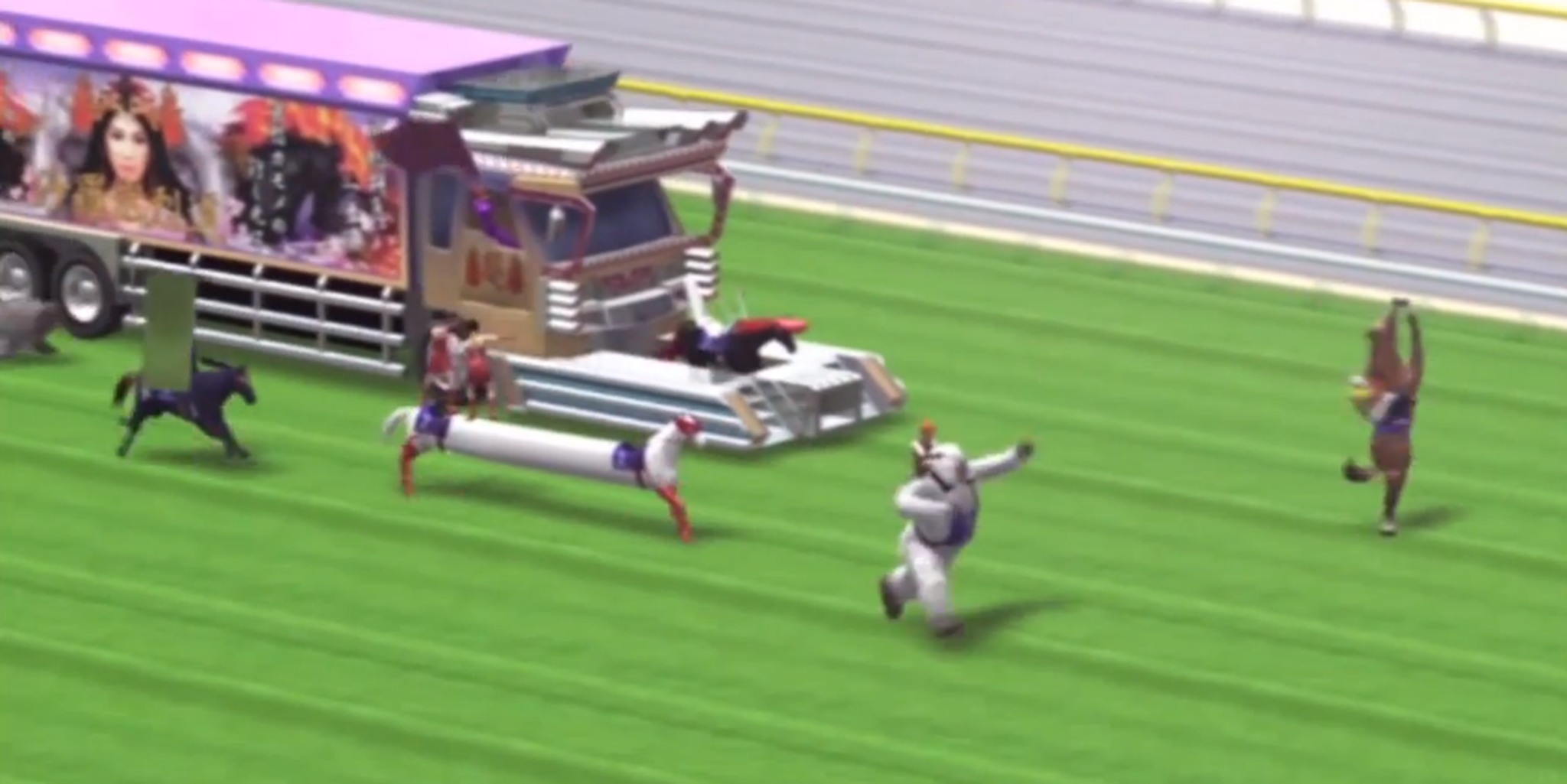 To say that the racing sequences are absurd would be an understatement. In May 2013, Hightower and AxialMatt of the Achievement Hunter Community Video channel uploaded a five-minute clip with footage from the third DVD to YouTube. The insanity of the game—which features a horse on its hind legs doing the Charleston as well as a limousine equine with multiple naked jockeys on its back—coupled with the hilarious reaction heard on the voice overs, is a great recipe for laughs.