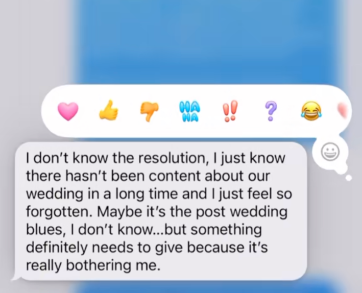 The bride responds, "I don't know the resolution. I just know there hasn't been content about our wedding in a long time."