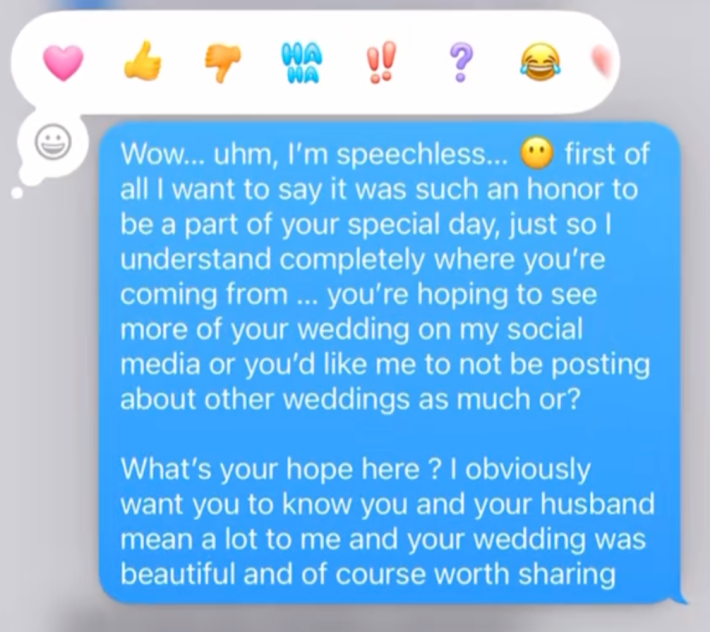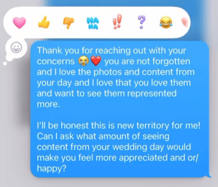The bride points out that she "invested a lot" in the photography services. She asks if Mahomey would post more content from their wedding.