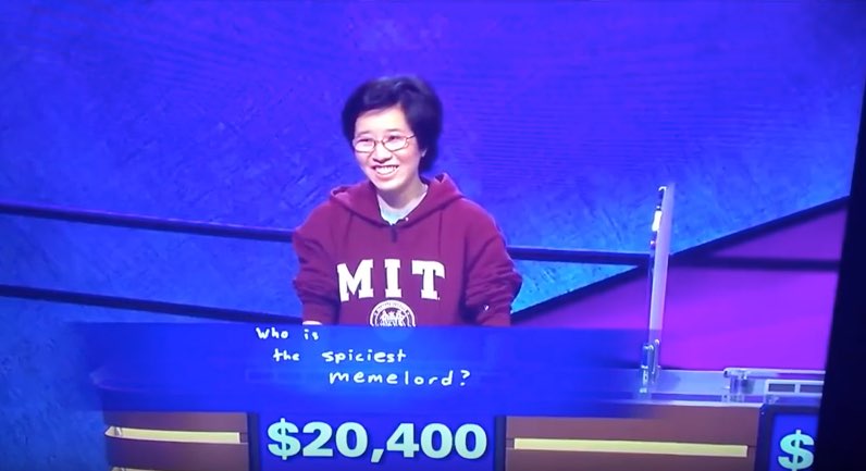 And, in the grand tradition of making Alex Trebek speak aloud various pop culture references that a 70-something erudite Canadian probably shouldn't know, Lilly Chen forced Trebek to ask: "Who is the spiciest memelord?" (He pronounced it properly, at least!)