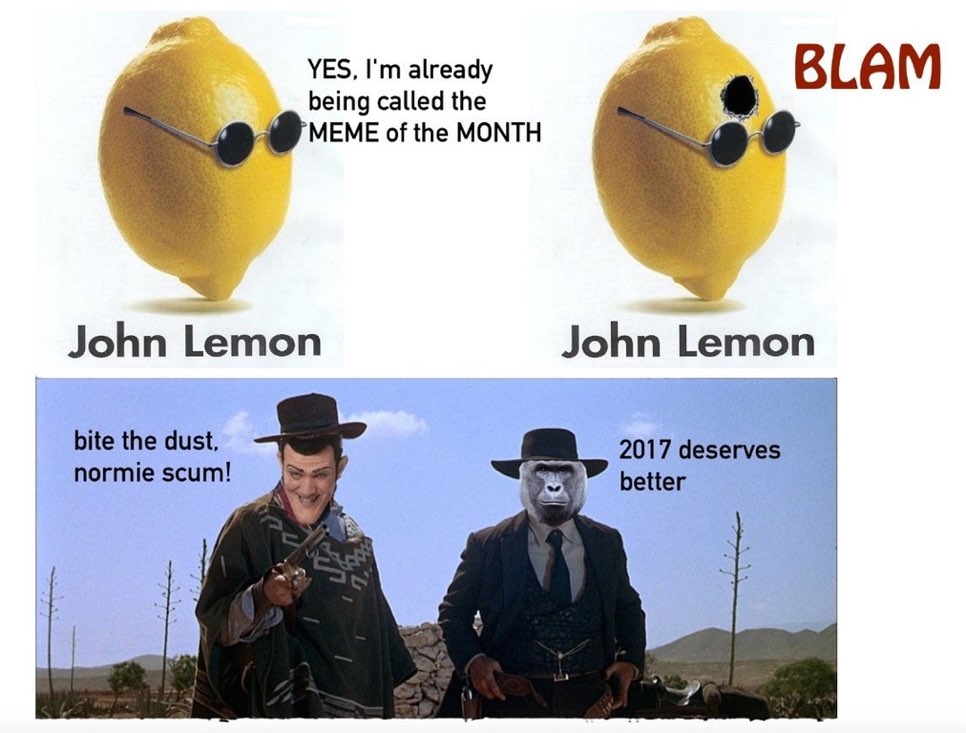 An overarching meme war for 2017 is beginning to take shape in just the first week, pitting a kind of retro meme literalism against the multi-layered irony that has defined dankness over the past couple of years. John Lemon, risen from his grave for about three days, was the first casualty.