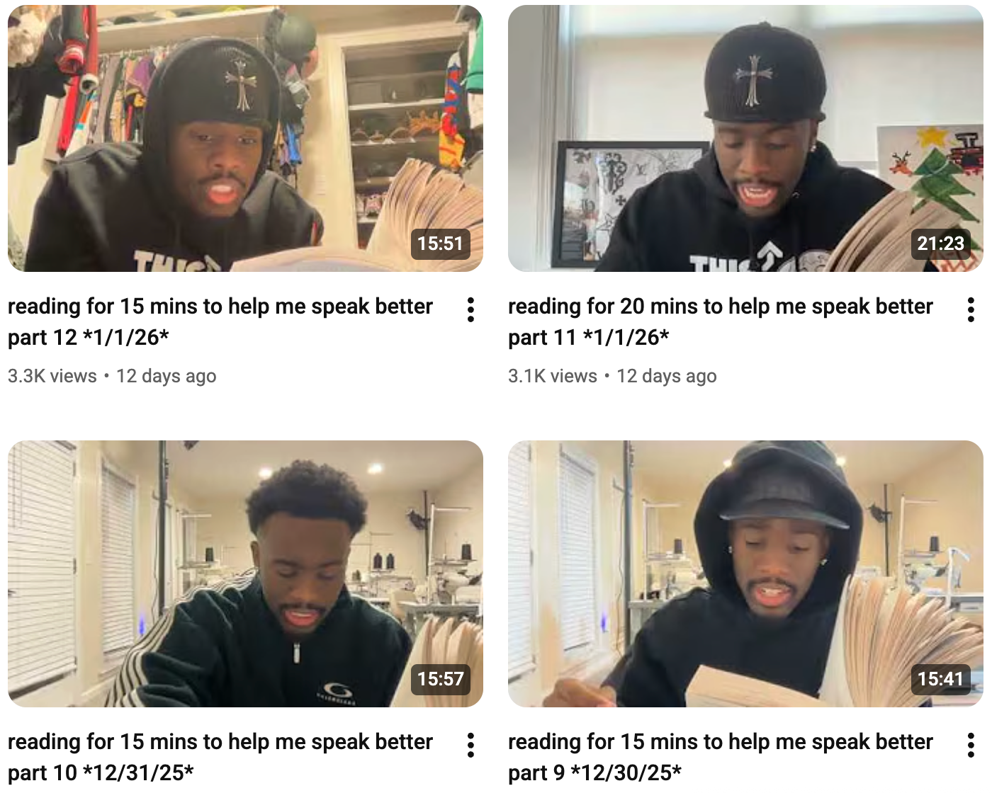 Meanwhile, Cenat has been tracking his reading process on a secret YouTube channel called Kai's Mind. He would upload videos with titles like the following: "Reading for 10 mins to help me speak better part 16 *1/7/26*."