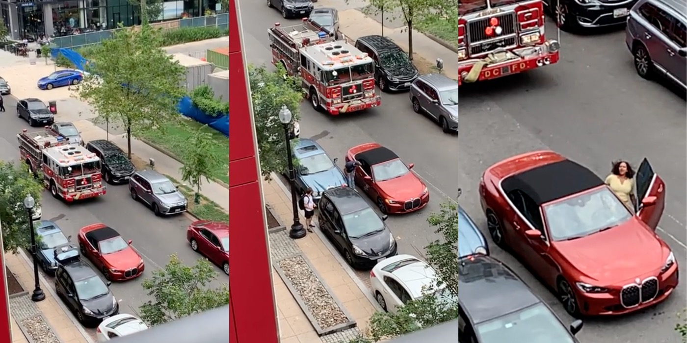 The woman finally gets in and drives away, allowing the firetruck to get through the tight street.