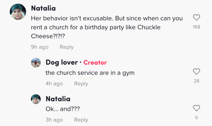 User @na_ta_li_a86 acknowledged the Karen while still agreeing with other viewers, saying, "Her behavior isn’t excusable. But since when can you rent a church for a birthday party like Chuckle [sic] Cheese?!?!?"