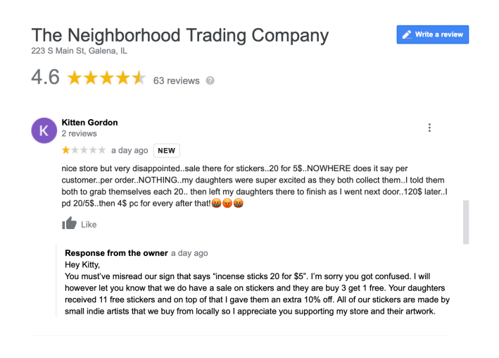 Scott then responded to the Google review and tried to explain to the disgruntled patron that there was, in fact, no sale of this kind, but that he had given her daughters a discount. He also thanked her for supporting his shop.