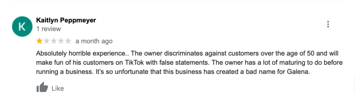 While most reviews are positive, Gordon is not the only patron that has left a 1-star review. A user under the name Kaitlyn Peppmeyer left this review a month ago: