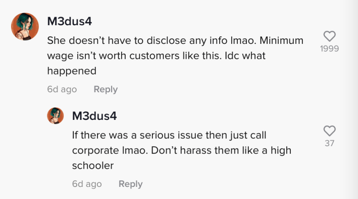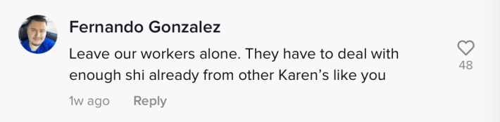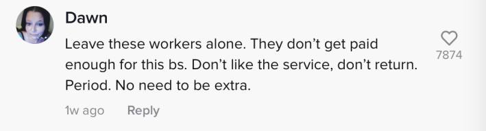 "Leave these workers alone," one commenter wrote. "They don't get paid enough for this BS. Don't like the service, don't return. Period. No need to be extra."
