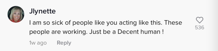 "I am so sick of people like you acting like this," another commenter wrote. "These people are working. Just be a decent human."
