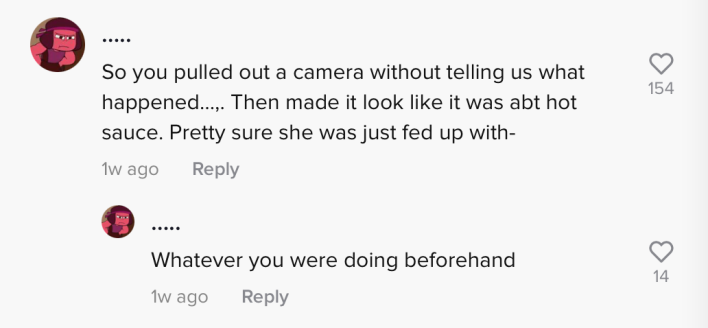 "So you pulled out a camera without telling us what happened...then made it look like it was about hot sauce," one commenter wrote. "Pretty sure she was just fed up with whatever you were doing beforehand."