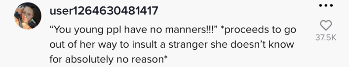 "'You young people have no manners,'" one commenter wrote. "*proceeds to go out of her way to insult a stranger she doesn't know for absolutely no reason*"