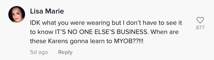 "IDK what you were wearing but I don't have to see it to know it's no one else's business," they wrote. "When are these Karens gonna learn to [Mind Your Own Business]?"