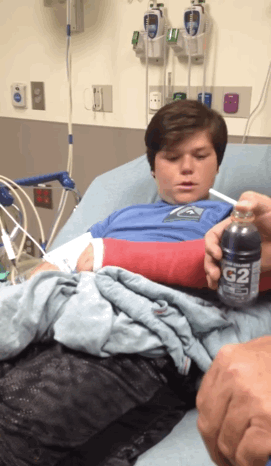 Meet Walker. He's busted his arm, is bed ridden, and is being straw-fed some purple Gatorade. Once he wakes up, however, he goes into an excited frenzy about the cast on his arm.
