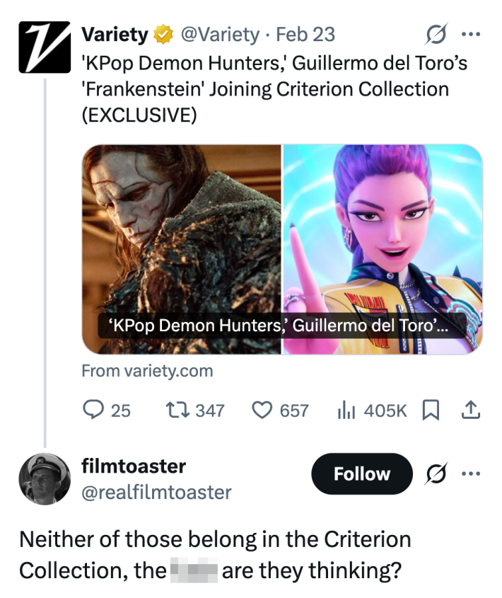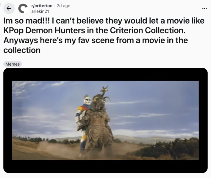 "This is so funny to me," wrote @daveleedwnundr. "Criterion completists waiting for the next Tarkovsky, Truffaut, Varda, or Kieślowski drop being forced to buy KPop Demon Hunters."