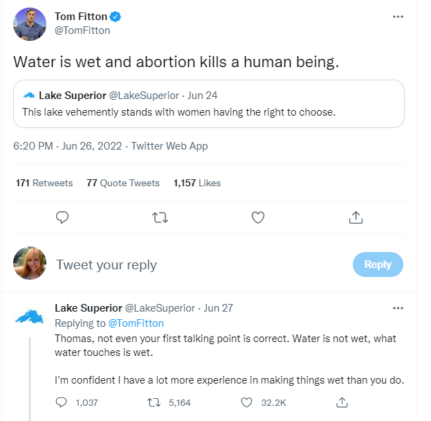 Fitton responded with this pithy retort: "Water is wet and abortion kills a human being."
