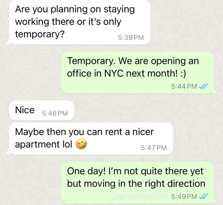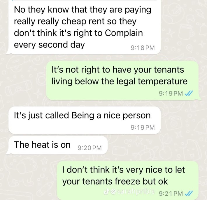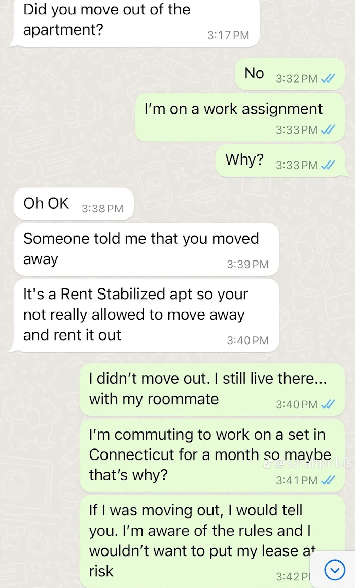 In a TikTok slideshow posted last week, Pribis shows WhatsApp messages that she has received from her landlord. Many include him asking if she's moved out or still living in the apartment, and accusing her of renting it out to someone else (which is illegal without landlord permission).