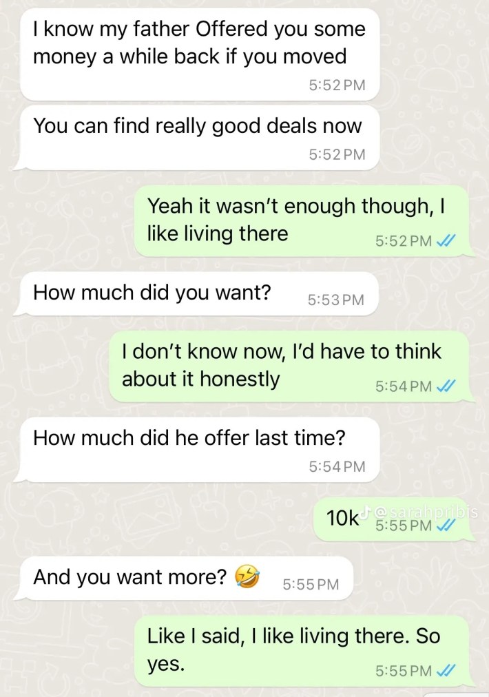 Pribis's landlord is seen asking her if she's moved out twice via WhatsApp and saying that she can rent a nicer apartment in screenshots she posted on TikTok. The landlord also reveals that his father attempted to pay Pribis to convince her to move out of the apartment, and he asks how much it would take to change her mind.