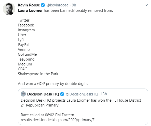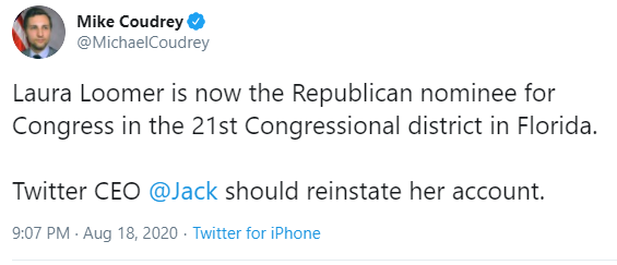 While other congressional candidates have been banned, Loomer seems to be the only one to have won a primary. Almost every candidate running for office these days has a Twitter presence. Loomer not being allowed one—despite her antics—could be considered Twitter unfairly tipping the scales.