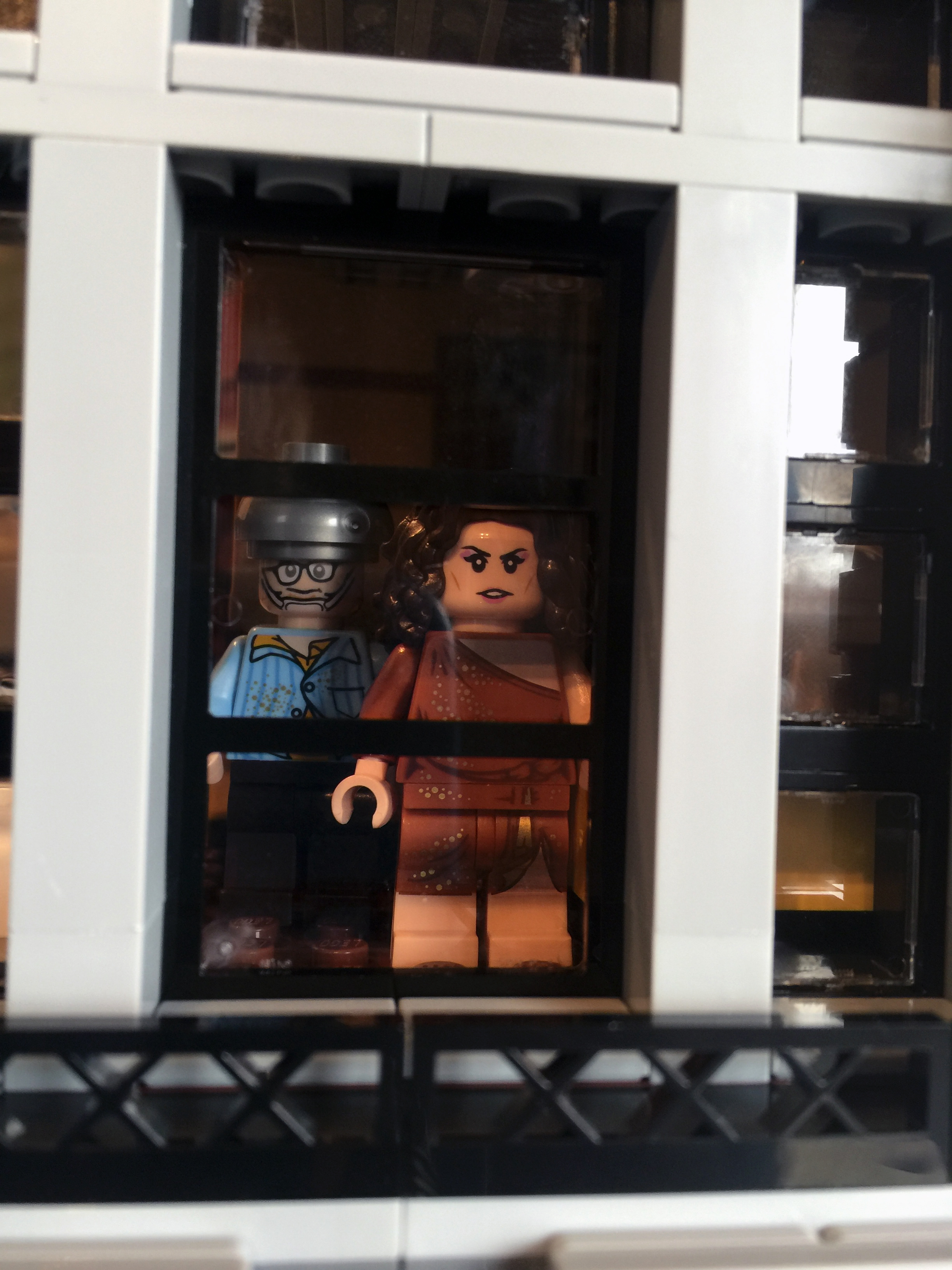 The building itself is something of a Lego architectural wonder. It’s a classic three-story New York brownstone—red-brick-stone, actually—segmented into three parts, two of which swing open to reveal the meticulously detailed interiors.