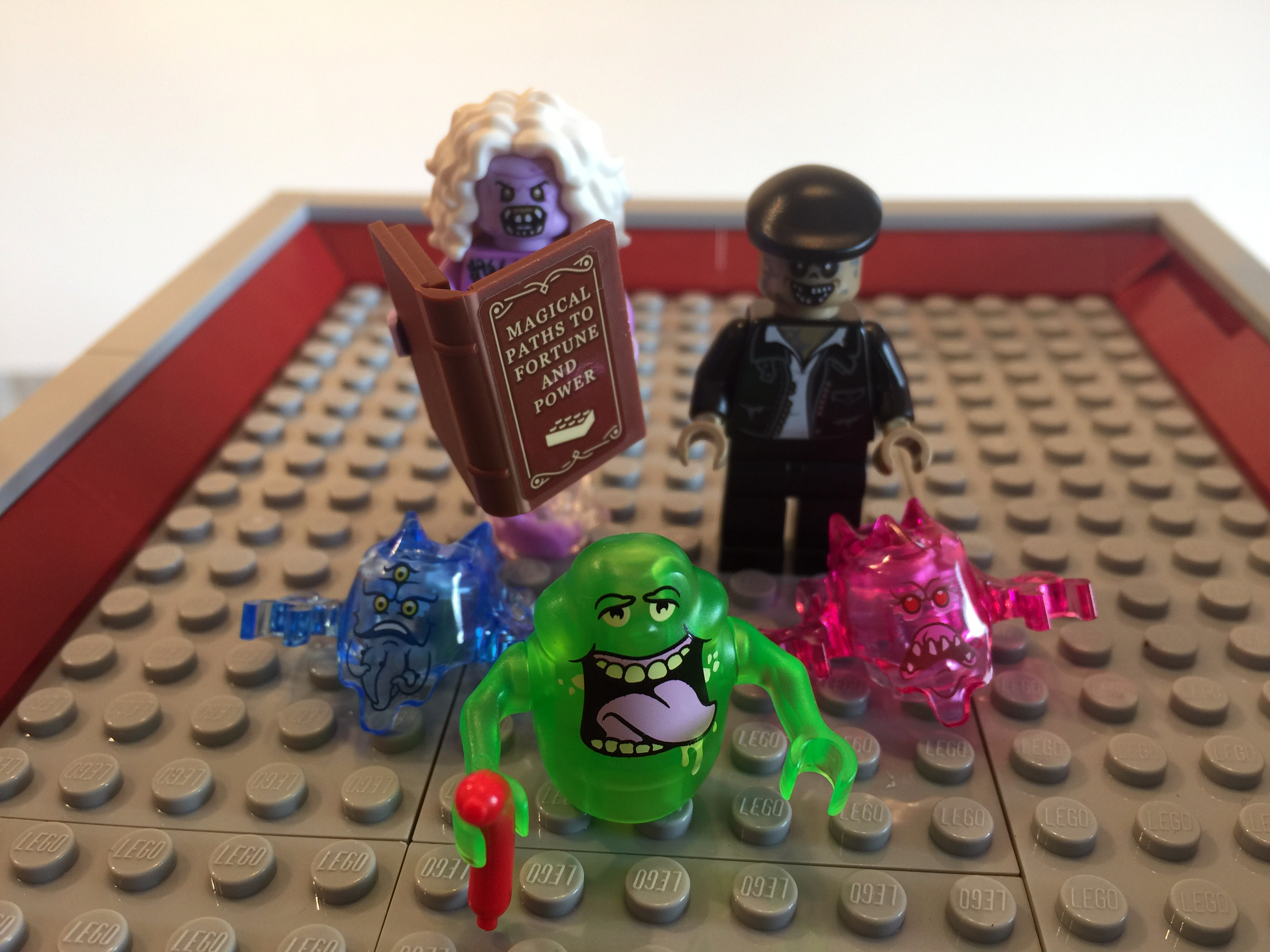 Rounding out the mini-figure assemblage are Louis Tully (Rick Moranis) and Dana Barrett (Sigourney Weaver). Tully can swap his regular hair for his supposedly protective colander hat, not that it’ll stop him from ultimately becoming the faithful servant of the almighty Zuul.