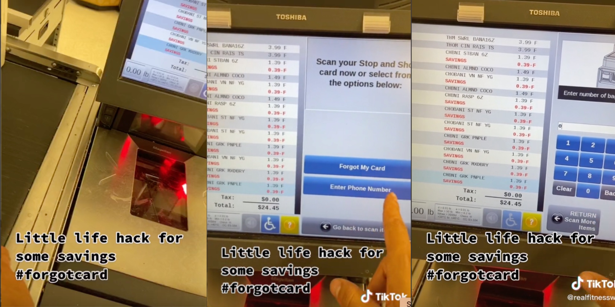 Shared by @realfitnesswill on TikTok, the video shows him selecting the "forgot card" option at Stop & Shop self-checkout so that he can get all the rewards card discounts. He also inputs "0" when the self-checkout asks how many bags he used. Overall, this saved him about $5.