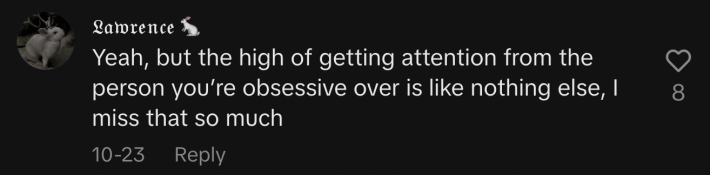“Yeah, but the high of getting attention from the person you’re obsessive over is like nothing else, I miss that so much.”