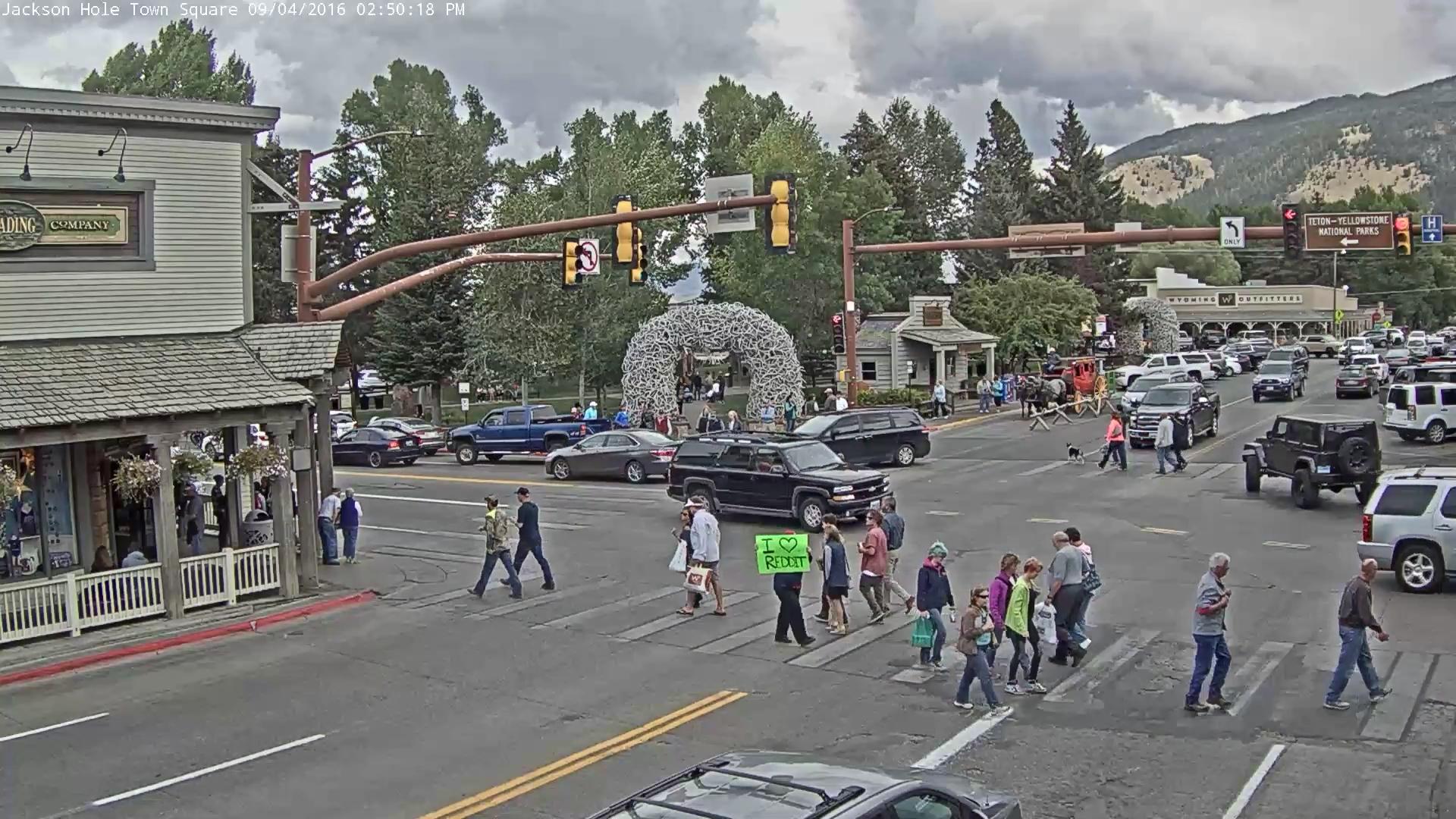 Jackson Hole and Grand Teton host close to a dozen live webcams of various regional tourist attractions in the area, including Yellowstone and Glacier National Parks. Presumably, they’re meant to give potential visitors a better sense of the attractions and the local weather and traffic. But for some reason, everyone is glued right now to the live feed of Jackson Hole Town Square.