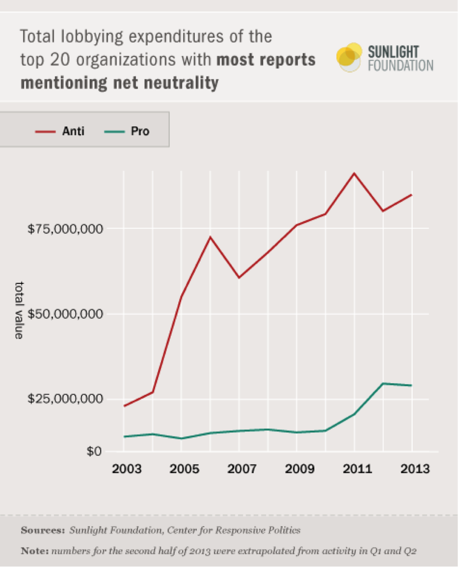 Going back to 2005 (when the phrase “net neutrality” first shows up in lobbying disclosure reports), the principle's biggest opponents (Verizon, AT&T, Comcast and their allies) have lobbied against net neutrality about three times as hard as the biggest proponents of neutrality (Level 3, Google, Microsoft and their allies).