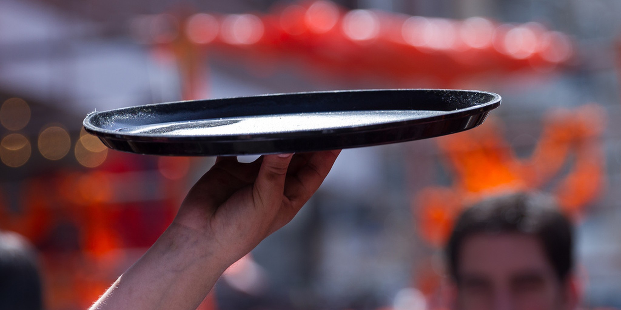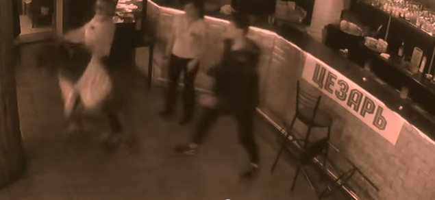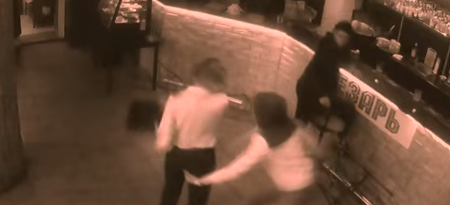 Somewhere in Russia and caught on video, a waitress brings the bill to two patrons. The man she's interacting with has the audacity to try to slip some money into her chest, and she ever so kindly pushes him off.