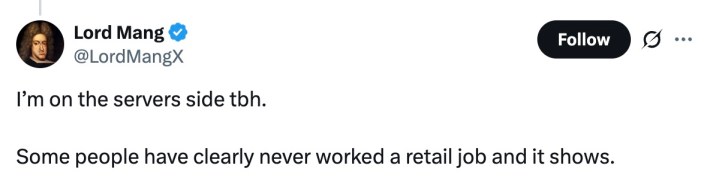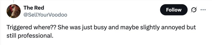 Out of hundreds upon hundreds of reactions to the video, there weren't very many people who found anything wrong with how the server acted. At most, some people agreed that she seemed vaguely annoyed with how she was being treated, but continued to act professionally and politely all the same.