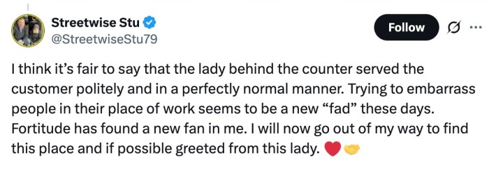 "Thank you, have a good one," the "rude" server said as she handed over her bag of goods.