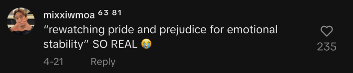 “‘Rewatching Pride and Prejudice for emotional stability’ SO REAL,” said @yiliinglaozuweiwuxian.