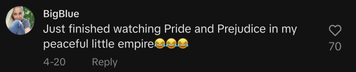 “Just finished watching Pride and Prejudice in my peaceful little empire,” said @spacevuk.