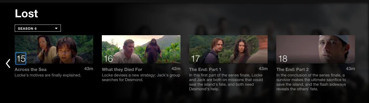 Lost fans on Reddit have noticed as early as last May that “The End,” the super-sized Lost finale that divides fans to this day, is missing more than 18 minutes of footage. The version that aired on ABC May 23, 2010 has a runtime of 104 minutes, while the version on Netflix comes in at 86 minutes on the U.S. site—two parts that are 43 minutes apiece.