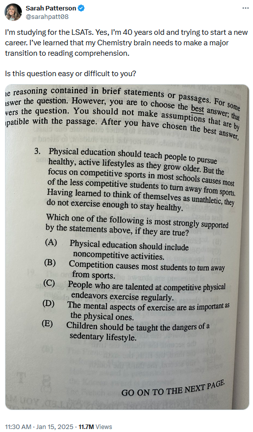 On Jan. 15, X user @sarahpatt08 posted a photo of a practice LSAT question, suggesting that she was unsure of the answer and hoped for validation that it wasn't obvious.