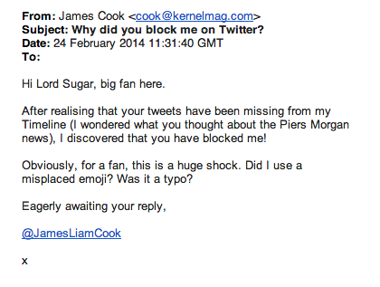 The first way to tackle this would be emailing the person who blocked you, since you cannot DM them, obviously. My colleague James Cook has tried this with the British equivalent of Donald Trump: @Lord_Sugar (3.38M followers). It worked, although Lord Sugar didn't actually reply to his email. He just suddenly unblocked him. Unblocking without acknowledging the request is a bit insulting. Here's his plea (click for full size):