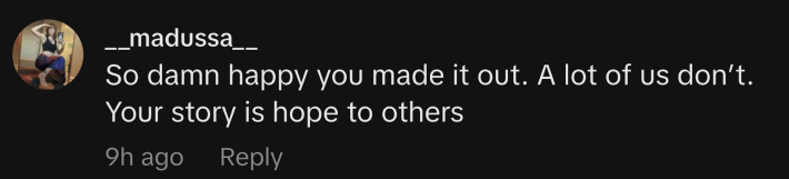 “So damn happy you made it out. A lot of us don’t. Your story is hope to others,” commented @__madussa__.