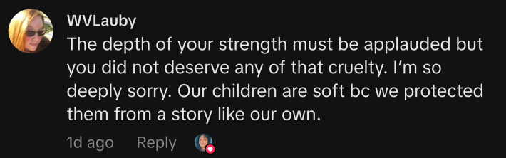 “The depth of your strength must be applauded but you did not deserve any of that cruelty. I'm so deeply sorry,” said @theshimocracy, “Our children are soft because we protected them from a story like our own.”