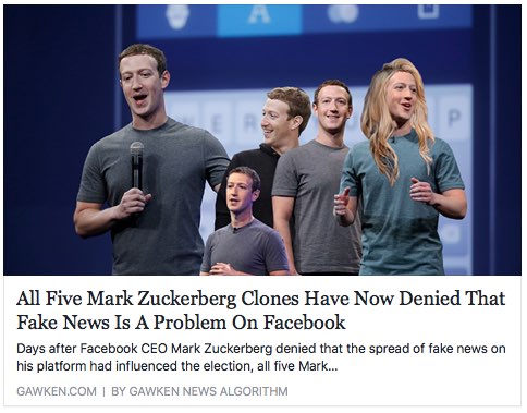 Let's see how comfortable Zuckerberg is with defending fake news now that it's about him. The very good trend of Zuck parody posts ranges from completely unbelievable (Gawker spoof site Gawken's "five Zuckerberg clones" story) to briefly convincing (Zuckerberg dead at 32?!).