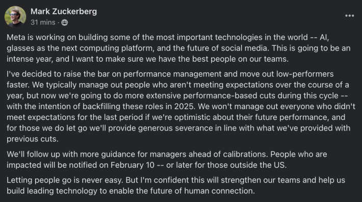 "We typically manage out people who aren't meeting expectations over the course of a year, but now we're going to do more extensive performance-based cuts during this cycle -- with the intention of backfilling these roles in 2025," Zuckerberg wrote. "We won't manage out everyone who didn't meet expectations for the last period if we're optimistic about their future performance, and for those we do let go we'll provide generous severance in line with what we've provided with previous cuts."