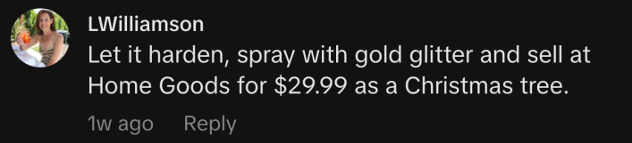 “Let it harden, spray with gold glitter, and sell at Home Goods for $29.99 as a Christmas tree.”