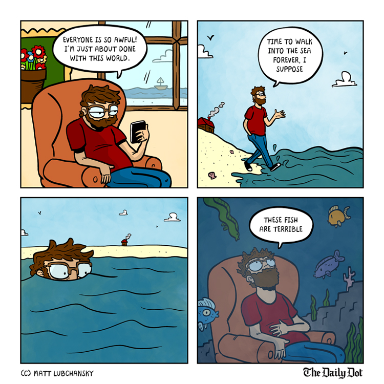 This a tough one. If I had an answer, it would definitely be a lot easier to write jokes because I could just keep going there. It really depends on the sort of comic I'm writing. If it's a story or something I work on, that looks a lot like me staring at a screen and just writing anything that comes to mind until something is useful. If it's something topical, it's a little easier to dick around online all day and see if anything makes me upset (a thing that will inevitably happen). If it's something goofy, those ideas tend to either come out of nowhere or after I've been drilling down on a simple concept for way too long. A lot of the comics I'm most proud of tend to be about the certain way people act in situations, or specific types of feelings I have that take basically months of thinking about them until I can distill them into four or six panels.