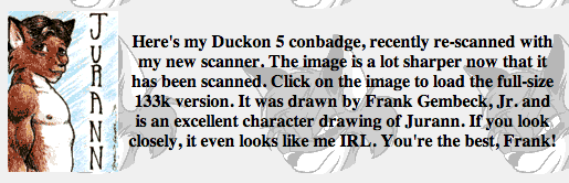 Jurann’s website, jurann.furcen.org, has an About page (published in 1997, last updated in January ’99) in which he posted his conbadges, portraits of himself submitted by other members of the fandom. They’re not humans—they’re erotic, muscular, genderless foxes with ambiguous genitalia. “It’s a great study of my character,” he says of one badge. On another: “The flaming red aura doesn’t do much for me.”