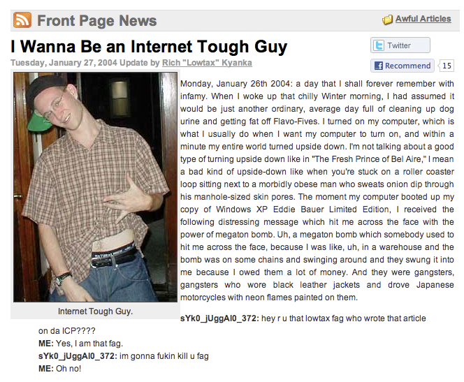 Before Reddit, the phrase “me irl” took off on Something Awful, whose subforum FYAD (short for Fuck You and Die) became an incubator for original content and irony-laden humor that, as John Herrman suggests, shaped the stream-of-conscious tone of Twitter coversations. It is now, as of Thursday, gone.