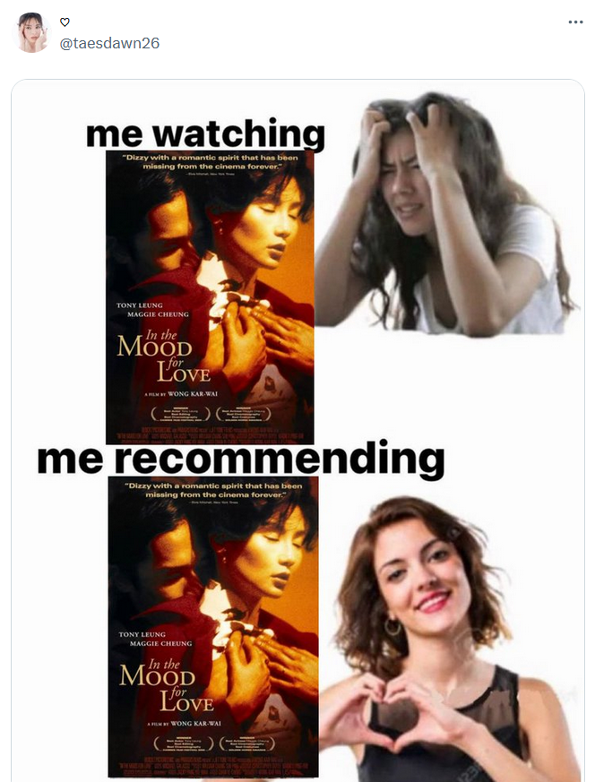 Popular entries have promoted films like the 2003 South Korean action-thriller hit Oldboy, which is best known for its horrifying twist ending, and the heart-wrenching 2020 romantic Hulu miniseries Normal People. This meme has already undergone one alteration, with a fan of the Netflix anime series Dungeon Meshi replacing the pained woman with a clone of the one doing heart hands.