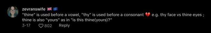 "'Thine' is used before a vowel, 'thy' is used before a consonant,'" one pedantic commenter wrote. "e.g. thy face vs thine eyes ; thine is also 'yours' as in 'is this thine(yours)?'"