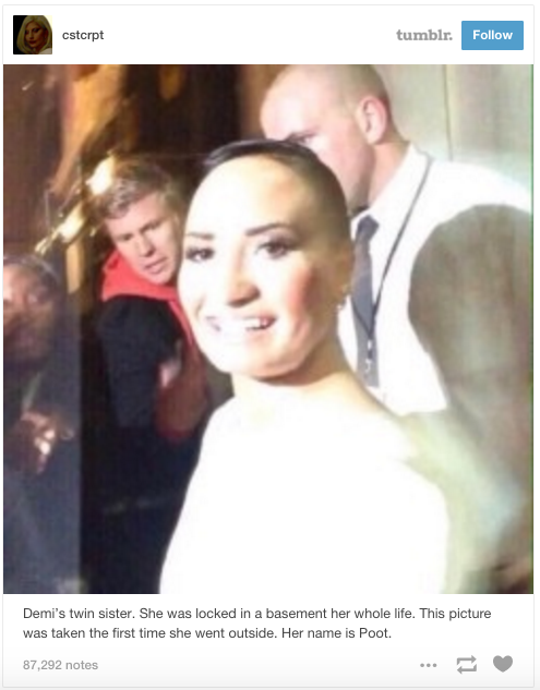 And if you were to take the Tumblr meme world at face value, here’s Demi’s ugly twin sister Poot finally seeing the light of day after a life in the basement.