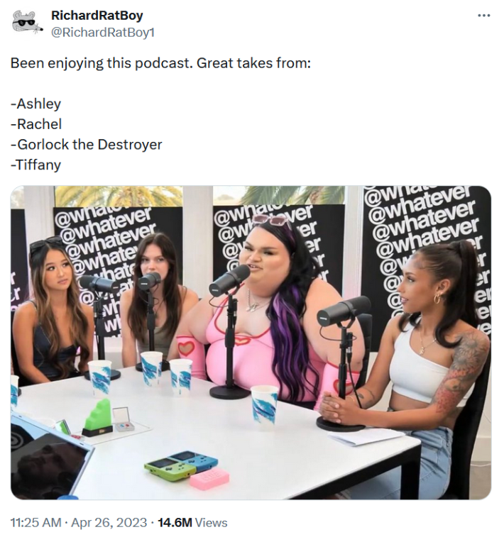 The name "Gorlock the Destroyer" was given by Twitter user @RichardRatBoy1 on April 26, 2023, one day after the podcast episode aired. In the tweet, he listed each guest's name incorrectly, with the other guests named things like "Ashley" and "Rachel," while Lopez was labeled with the designation that would become the meme.