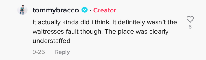 When someone asked Bracco if the stunt worked to get the attention of a waitress, he said he thought so but that the place was understaffed and it likely wasn't her fault. "It actually kinda did I think," he wrote. "It definitely wasn't the waitresses fault though. The place was clearly understaffed."
